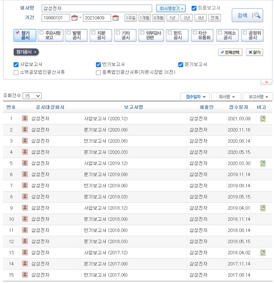 전자공시시스템에 접속해 보면 일단, 종목과 원하는 공시를 지정해 검색을 하게 된다. 우리는 이 검색결과를 저장할 수 있다.