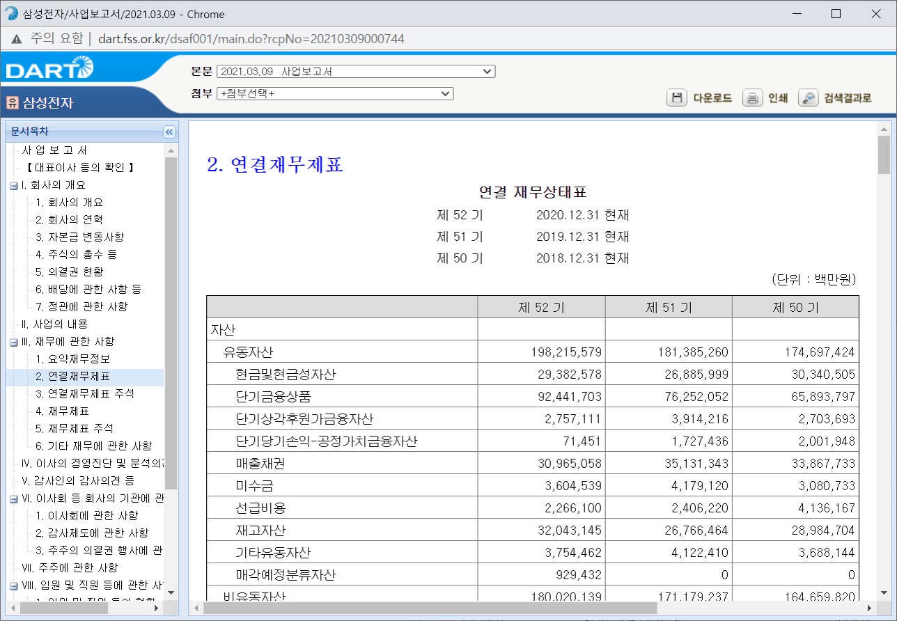 이제 원하는 공시를 클릭하면 새로운 창이 나타나면서 공시 내용을 열람할 수 있다. 가령, 재무제표를 보려면 분기/반기/사업보고서 를 찾아야 하는 식이다. 이 페이지의 url 역시 저장해두는 게 좋겠다.