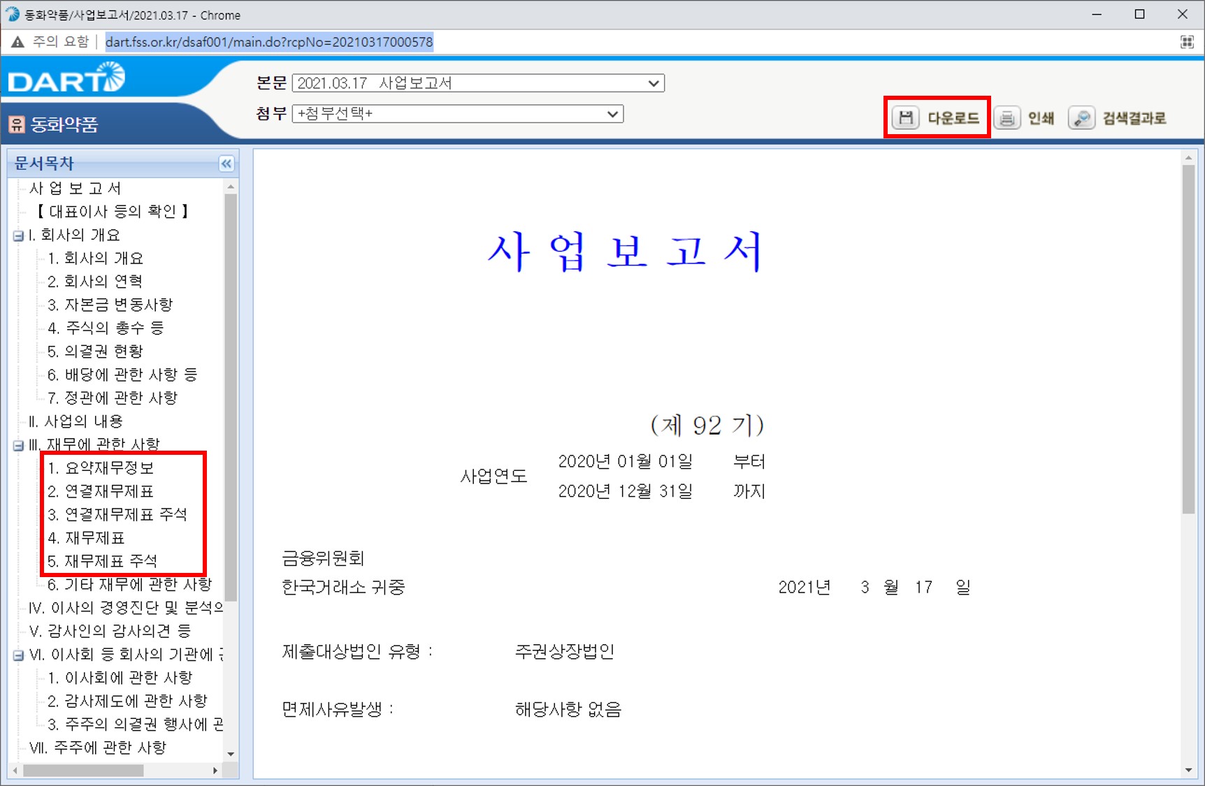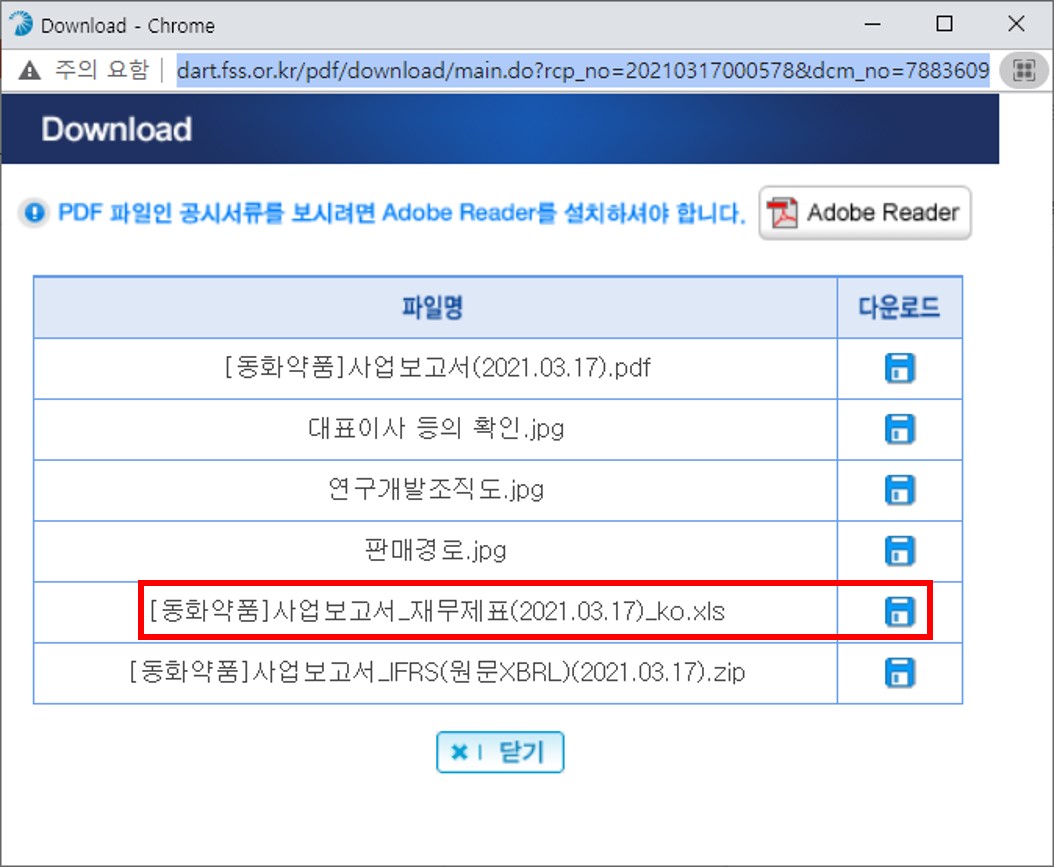 사업보고서 오른쪽 위에 보이는 "다운로드" 아이콘을 클릭해 보자. 새로운 창이 열리면서 재무제표 엑셀파일을 다운받을 수 있는 메뉴를 제공해준다. 이 부분을 클릭하면 파일이 컴퓨터에 저장된다. 이 과정을 컴퓨터에게 맡길 수도 있다. 열려 있는 각각의 창이 가리키고 있는 URL을 잘 따라가보면 된다.