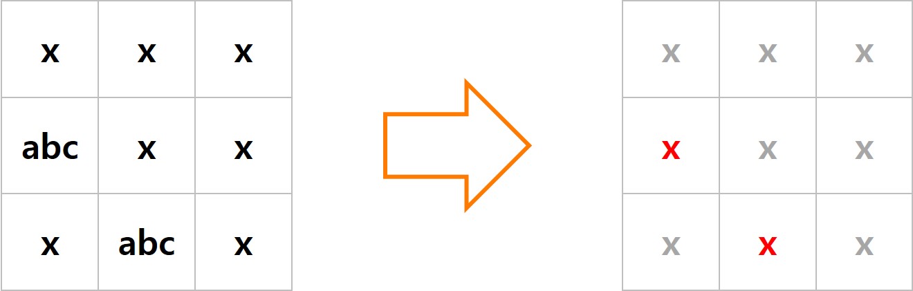 이렇게 보일 수 있다. 주황색 마스크는 입력된 조건을 만족하는 자리가 뚫린 행렬이다. x는 입력해야 할 자리에 넣을 새로운 단어로 이루어진 행렬이고, 가장 마지막 A는 조건이 불발되어 모양자의 막힌 자리에 채워질 단어들로 구성된 행렬이다. 따라서 이렇게 작업을 해주면, 그 결과도 행렬의 형식으로 나타나게 된다.