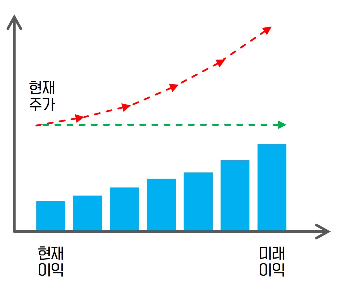 돈을 조금밖에 못 버는 회사가 있다. 하지만 시장이 확대되고 R&D와 혁신이라는 무기를 장착한 이 기업은 그 성장성을 인정받아 현재 주가는 높은 상태다. 흔히들 얘기하는 고PER 성장주다. 백 번 양보해서, 이 기업의 미래이익이 확정적이라 치자. '현재' 주가는, '미래' 이익에 비해 저렴할지도 모른다. 만일 주가가 초록색 화살표를 따라 그대로 유지될 때에나 들어볼 법한 얘기다. 난센스다. 가격이 바뀌지 않을 거라면 이 주식을 살 이유가 없다. 지금 사서 나중에 팔아도, 투자자가 기대할 수 있는 이득은 '0'이다.