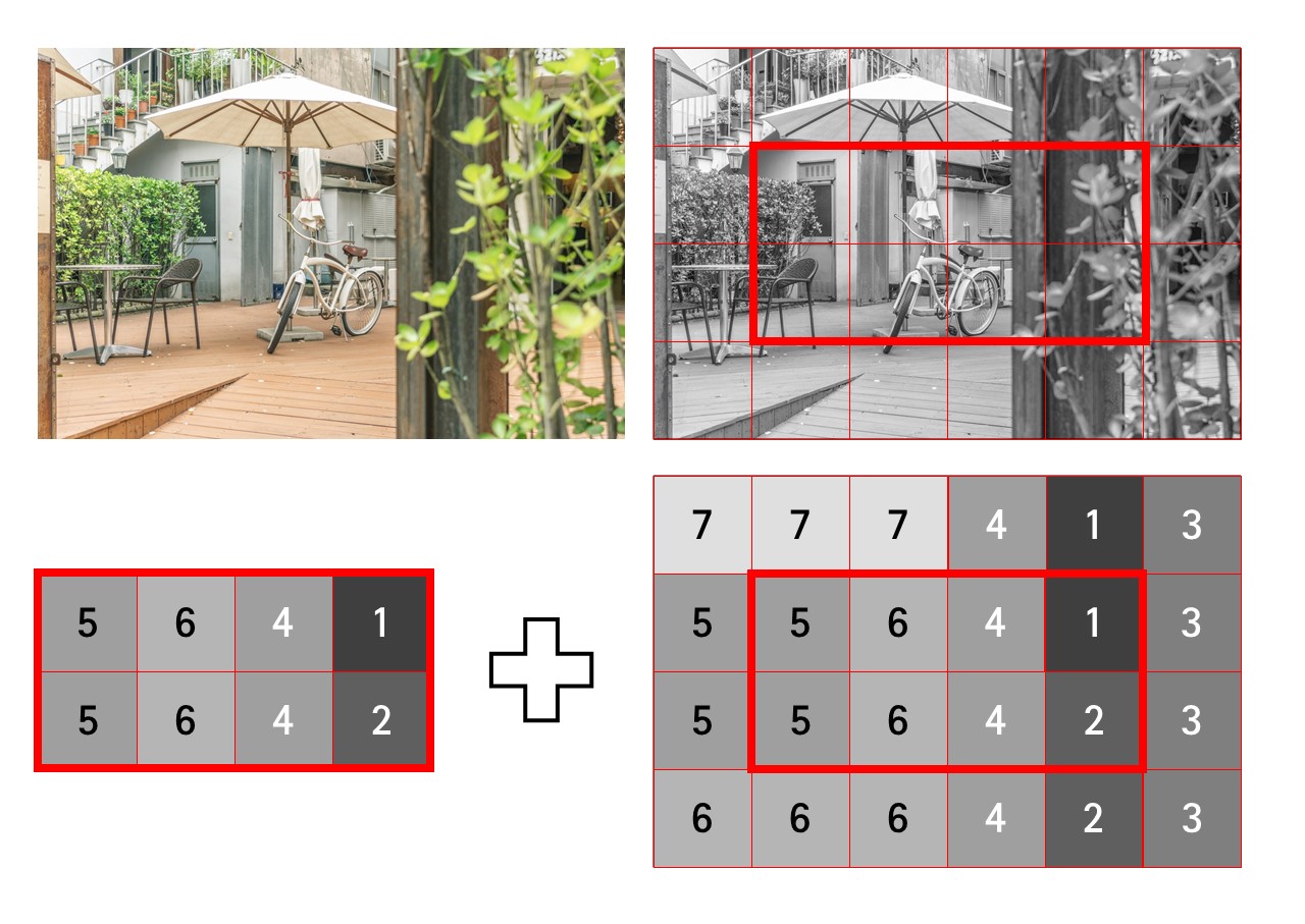 중앙부 중점 측광도 있다. 전체 픽셀의 흑백 톤을 평균한다는 점은 동일하다. 대신 프레임 중앙부의 픽셀에 가중치를 주고 평균이 계산된다. 지난 포스팅에서 만들어 둔 24화소 사진에서, 중앙부 4 * 2 = 8개의 픽셀에 2배의 가중치를 줘보자. 픽셀 각각이 두 픽셀 몫을 한다고 보면 쉽다. 전체 픽셀이 24 + 8 = 32화소가 되는 셈이다.