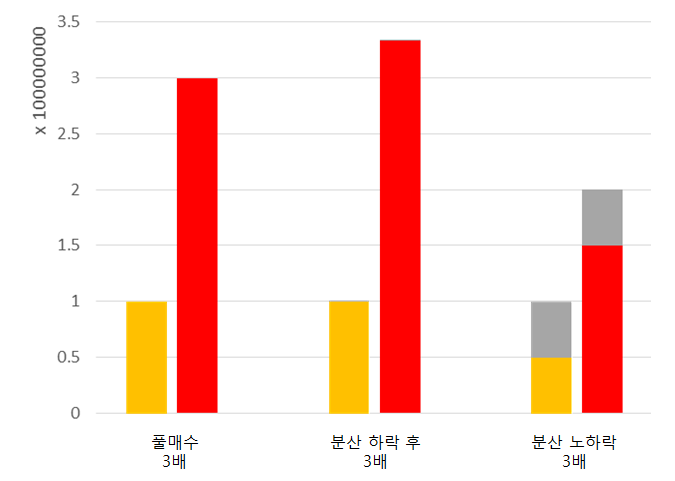 간단한 시뮬레이션을 해봐도 시각적으로 와 닿는 결과를 알아볼 수 있다. 목표수익률이 200%일 때와 10%일 때를 나누어 생각해 봤다. 각각의 경우 안에는 다시 풀매수 시나리오, 분할매수 성공 시나리오, 분할매수 실패 시나리오가 있다. 분할매수를 위해 남겨둔 현금이 추가적인 하락국면에 투입되어 평균단가 낮추기가 포함되면 성공, 주가가 하락없이 상승해 기회를 얻지 못하면 실패다.