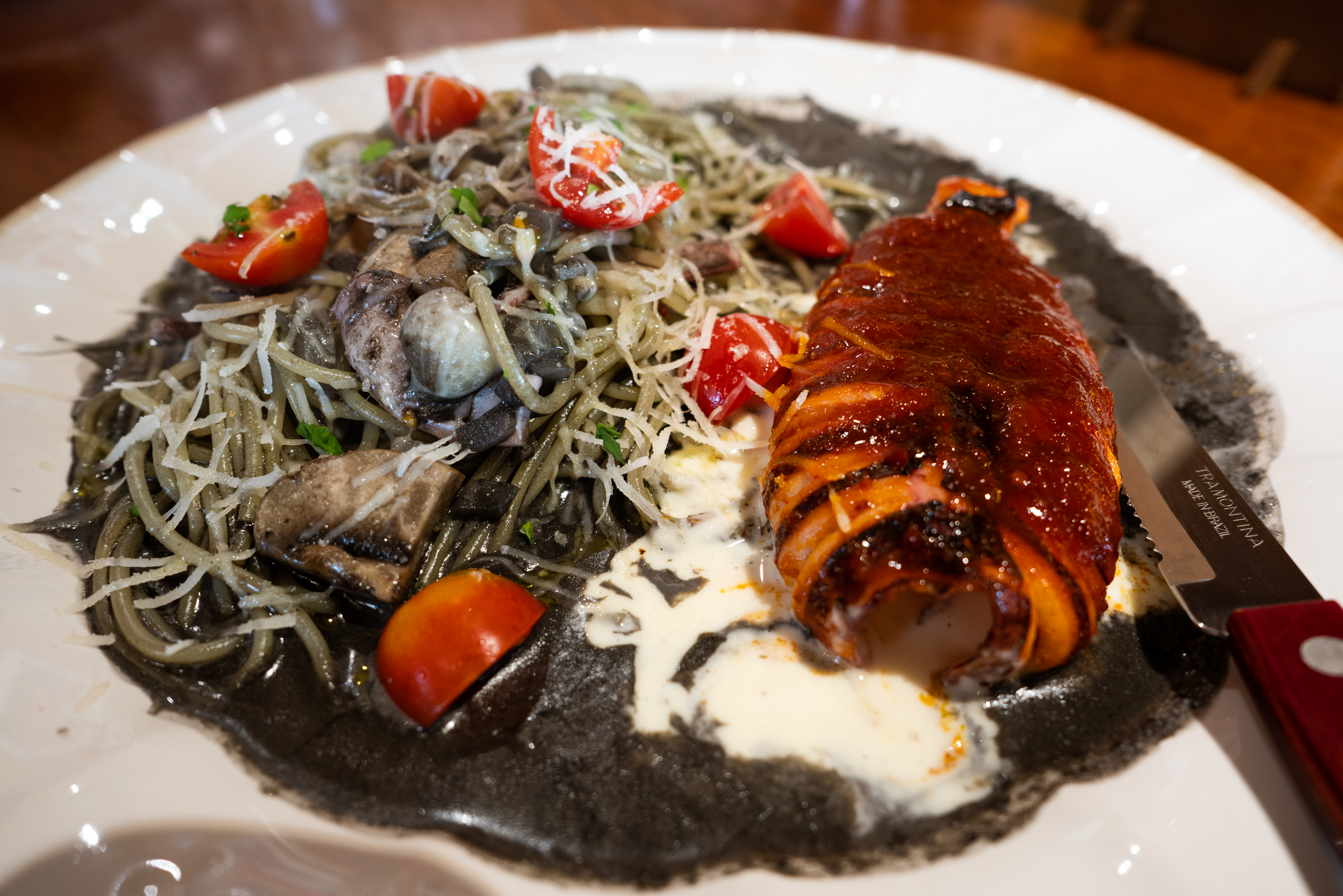 그레이비의 시그니쳐 메뉴는 통오징어먹물크림파스타라고 하던데, 국적불명의 퓨전요리를 그닥 좋아하지 않는 나로서는 특색없는 요리라는 생각이 들었다. 통오징어에 입혀진 고추장맛이 먹물소스의 담백함을 잡아먹었다. 파스타 위에 따로 매운 맛이 나는 소스가 소량 올려져 있었던 점은 훌륭했다. 직접 잘라서 먹는 통오징어 살결도 질기지 않고 부드러웠다.