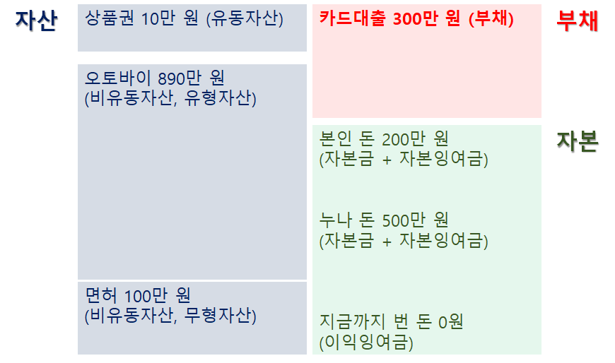 너 이거 어디서 났어? 무슨 돈으로 샀어? 300만 원은 신용카드에서 대출하고, 가지고 있던 돈 200만 원과 누나한테서 투자받은 돈 500만 원을 합쳤단다. 대출 300만 원은 부채다. 친구가 오토바이를 팔아 청산하면 가장 먼저 갚아야 하는 돈이다. 나머지 부분, 그러니까 투자받은 돈과 잉여금은 모두 자본으로 분류된다.