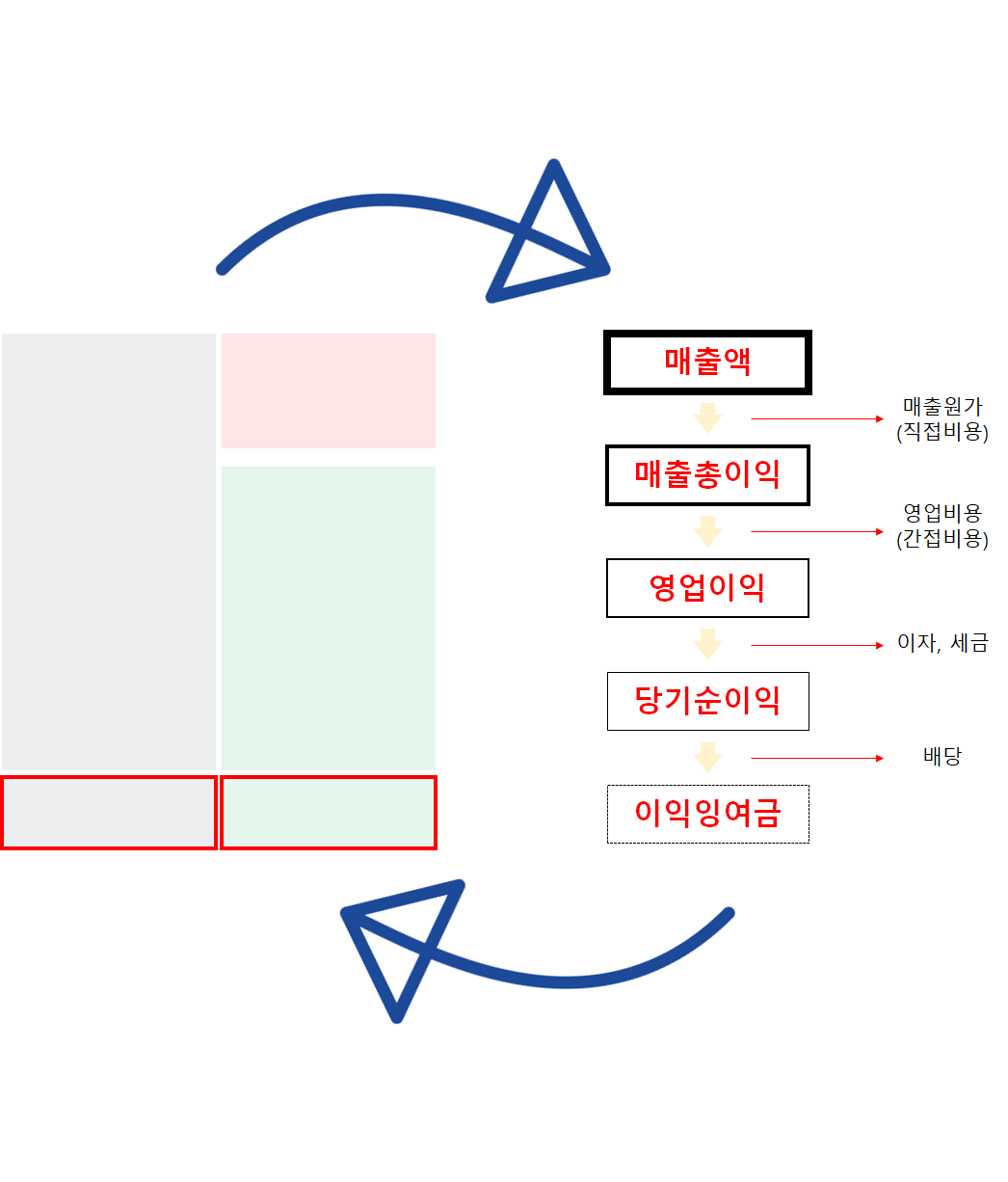 이제 무한 루프가 완성됐다. 부채와 자본으로 마련한 자산이 사업을 영위한다. 매출액 영업이익 당기순이익 어쩌고 해서 남은 이익잉여금이 자본에 쌓인다. 자산은 늘어난다. 더 큰 규모로 사업을 영위한다. 매출도 늘고 영업이익도 늘고 순이익도 늘고, 이익잉여금이 또 쌓인다. 자산은 늘어난다. 더 큰 사업을 영위하고...
