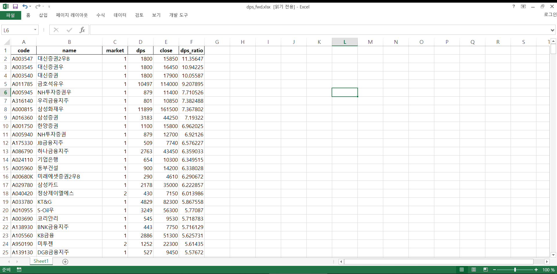 추정DPS에 대한 컨센서스가 없는 기업들의 예상 배당금은 -1로 기록했다. 나중에 종목들을 가려낼 때 예상 배당금이 0보다 큰 녀석들만 간추리면 된다. 500여 개가 남았다. 이렇게 완성된 표에서 종목코드를 끌어다가 차트를 읽고 최근 수정종가를 가져오면 예상 배당수익률을 계산해낼 수 있다. 내림차순으로 정리한 뒤 엑셀파일로 저장했다.