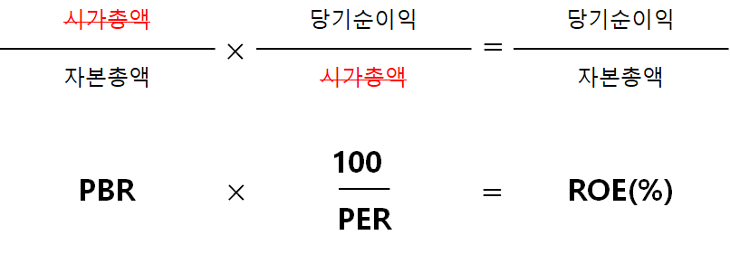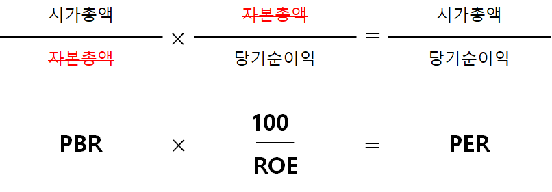 부연 설명하자면, 항을 요리조리 옮겨 PBR을 PER로 나눈 백분율이 ROE라는 것도 알 수 있다. 이건 시가총액을 소거시킬 공통요소로 파악한 계산이다. ROE가 커지는 데에 PBR이 너무 작은 건 도움이 안된다. PER이 적당히 커지면 PBR도 따라서 늘어야 한다. 뭐 결국 고평가라는 얘기가 된다. 반대로 ROE가 커야 하는데 PBR이 상당히 작다면, PER도 낮아야, 즉 돈을 잘 벌어야 한다는 얘기가 되기도 한다.