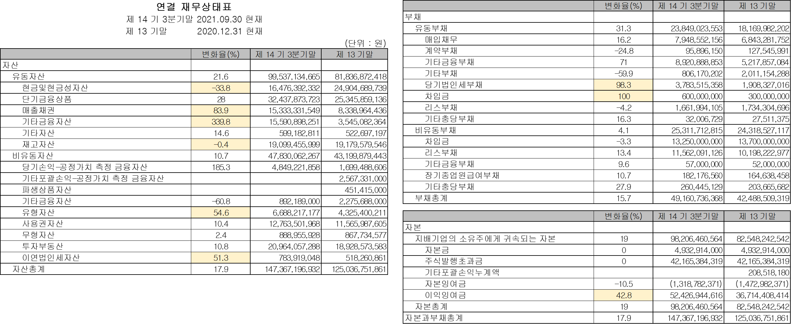 왼쪽에 자산, 오른쪽에 부채와 자본을 분리해뒀다. 굵직한 변화만 확인해보자. 매출채권이 늘었다. 이연법인세와 법인세부채 변화를 보니, 전년도 법인세비율이 올해보다 낮았던 게 생각이 난다. 역시 세율은 19%로 잡는 게 좋겠다. 차입금이 늘었고 현금성자산도 줄었는데, 어디에 큰 돈이 들었던 게 아닐까. 유형자산도 꽤 늘어난 걸 보면. 성수동 공간플랫폼 LCDC 밖에 생각이 안난다. 주석에서 확인이 안되면 IR 담당자에게 물어보는 길도 있다.