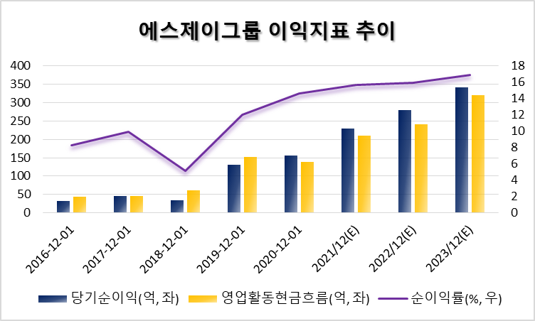 에스제이그룹은 성장하고 있는 회사다. 2021년 예상치까지를 기준으로 하면 순이익 성장률은 연평균 47%, 영업현금흐름 성장률은 연평균 37%다. 캉골과 헬렌카민스키 오프라인 매장이 늘면서 물리적 노출 자체가 확장된 결과일 것 같다. 캉골키즈가 여전히 매장 수를 늘리고 있고 온라인 비중 확대 덕분에 순이익률이 높아지면서, 향후 1년 정도는 추가적인 성장이 약속된 것으로 보인다.