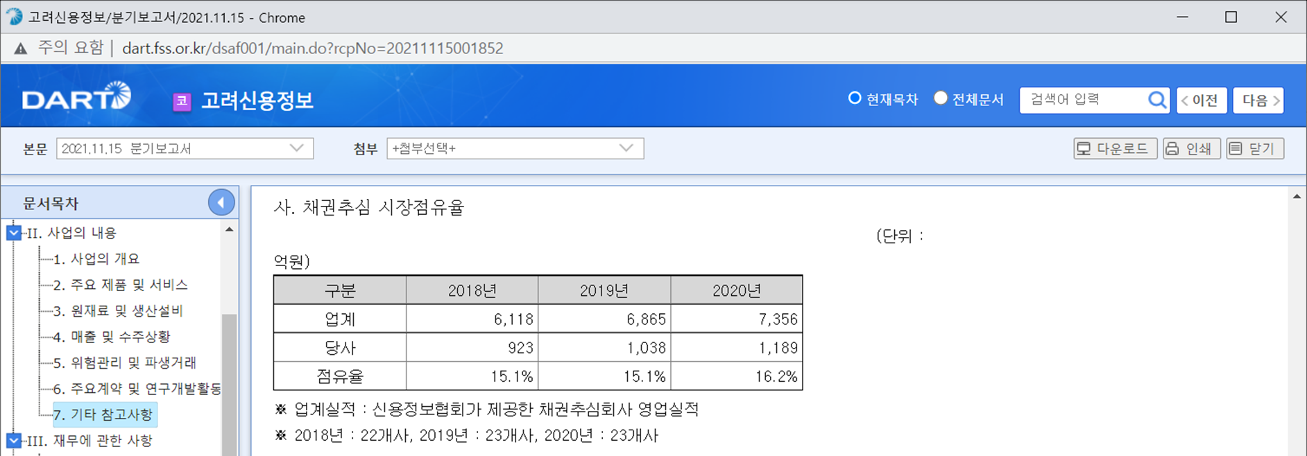 업종과 산업에 대한 기초자료는 보통 '기타 참고사항'에 별도로 있거나, '사업의 개요'에서 찾게 되는 경우가 많다. 일단 고려신용정보는 이 바닥의 1위다. 업체가 23개나 있으니까 다소 경쟁이 치열할 것 같은데, 시장점유율 기준으로 보면 압도적이다. 2~3위 업체의 점유율을 더 알 수 있으면 좋겠는데 상장사는 고려신용정보 한 곳뿐이라 리서치가 필요하다.
