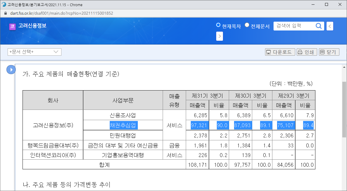 투자 아이디어 단계에서 확인했던 썸네일을 복기해보면, 고려신용정보는 채권추심업을 하는 회사다. 이 서비스의 비중이 매출의 90%니까 다른 복잡한 고려[!]는 하지 않아도 괜찮다. 일단 심플한 출발이다.