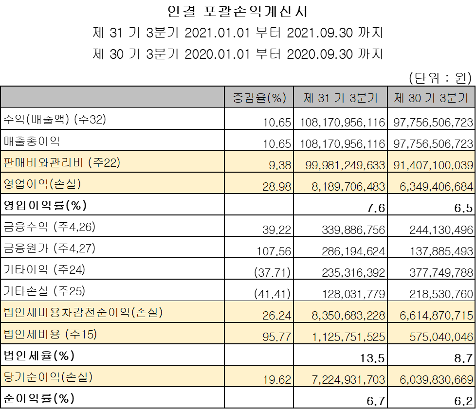 매출액이 10%+α 늘어나는 동안 판관비가 10%-β 성장했다. 정말 별 것도 아닌 차이인데도 영업이익이 29% 뛴 것으로 느껴질 지경이다. 덕분에 다른 데서 약간 까먹더라도 세전 이익이 성장률을 유지했다.
