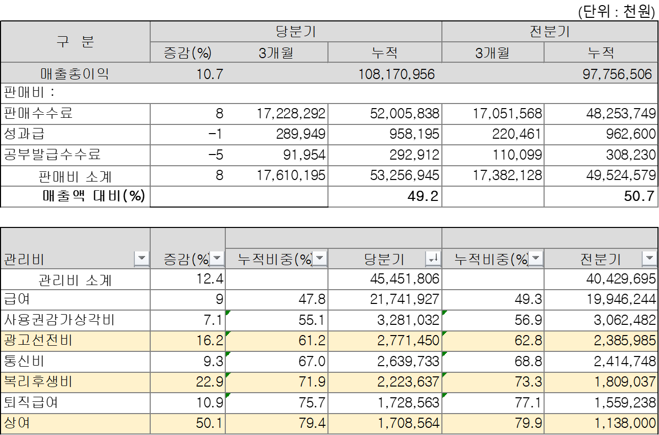 (연결재무제표 아니고) 재무제표 주석에 있는 판매비와 관리비 상세내역을 엑셀에다 긁어왔다. 매출액의 절반이 판매수수료로 날아간다. 나머지 관리비의 대부분(80%)은 인건비랑 감가상각비로 구성돼 있다. 매출액 성장률과 비교하면 오히려 관리비는 더 지출됐다. 판매비가 상대적으로 덜 늘었는데, 어차피 저건 통채로 변동비인 것 같으니까, 1~3분기 누적으로 덜 늘었다고 굳이 기뻐할 일은 아닌 것 같다. 4분기까지 뚜껑 열어보면 비용을 아낀 게 아니거나, 맞더라도 올해의 일시적인 현상일 수도 있다는 뜻이다.