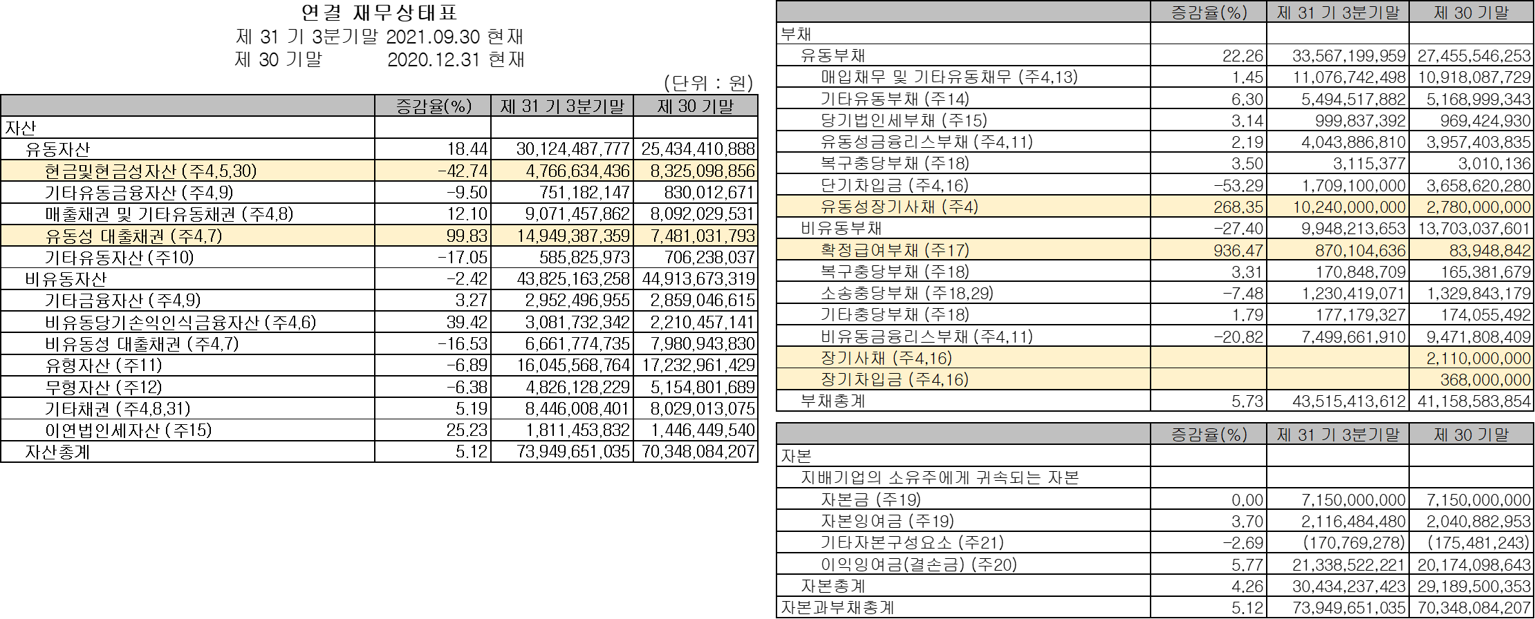 큰 액수의 변화만 훑어봤다. 유동성 대출채권이 늘었다. 무슨 돈으로 샀을까? 현금이 줄어든 걸 확인할 수 있고, 유동성 장기사채가 늘어난 것도 보인다. 확정급여부채도 늘었는데, 장기사채와 장기차입금이 사라지면서 부채가 늘어나는 걸 상쇄했다. 전체적으로 보면 그래서, 부채도 약간만 늘고 순자산도 약간만 늘면서, 균형은 잘 맞춰지고 있다.