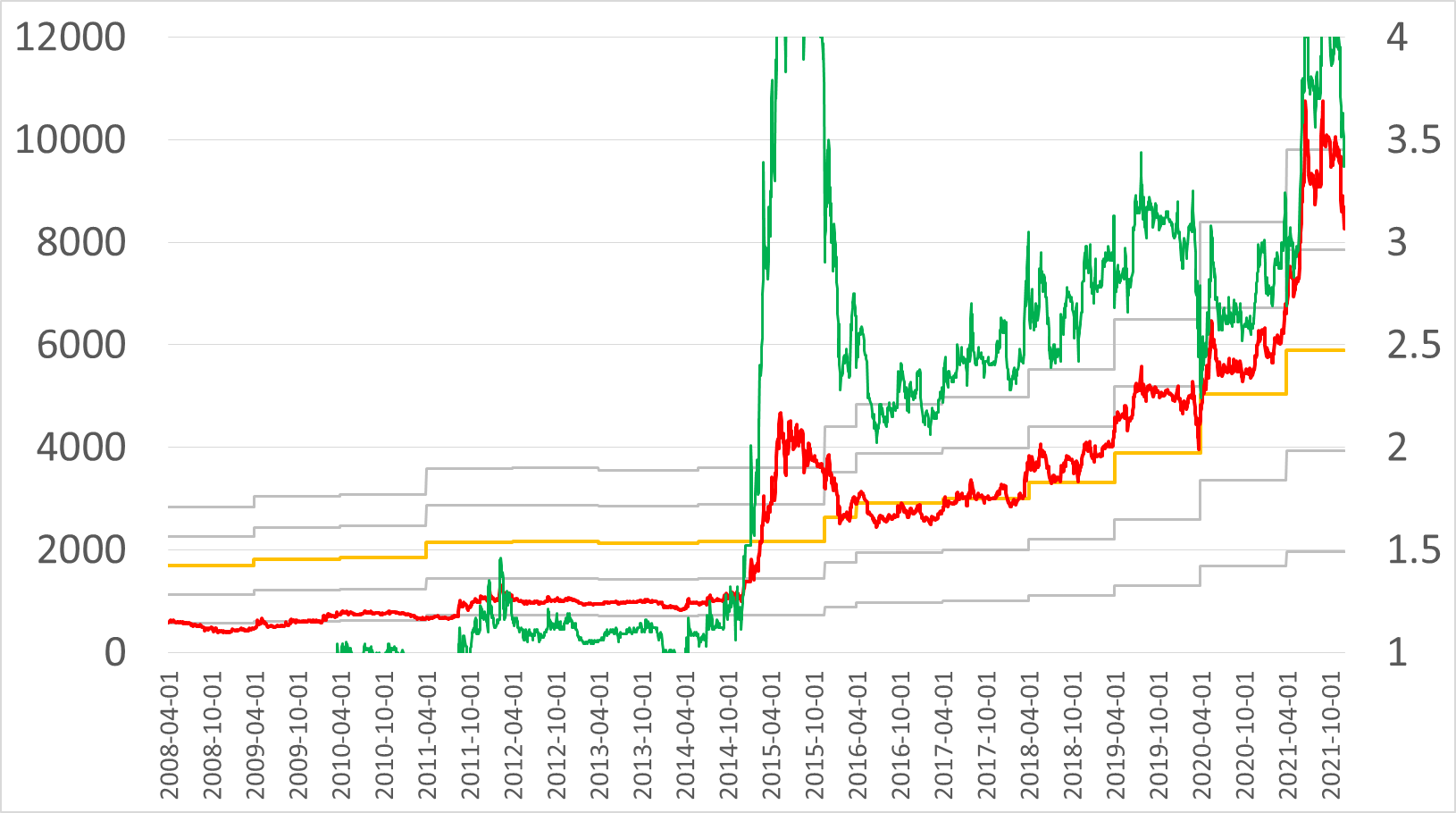 왼쪽이 PER, 오른쪽이 PBR 밴드다. 초록색 선은 주가에 따라 변한 PER, PBR 값이니까 각각 오른쪽 세로축을 통해 값을 확인하면 된다. 최근 몇 년간 PER은 10배가 되면 위로 튀어오르다가, 더 가까운 최근에는 변동이 커졌다. 현재는 12배. PBR은 2.4배 선(노란색) 위에서만 놀고 있다. 지금은 4배까지 갔다.