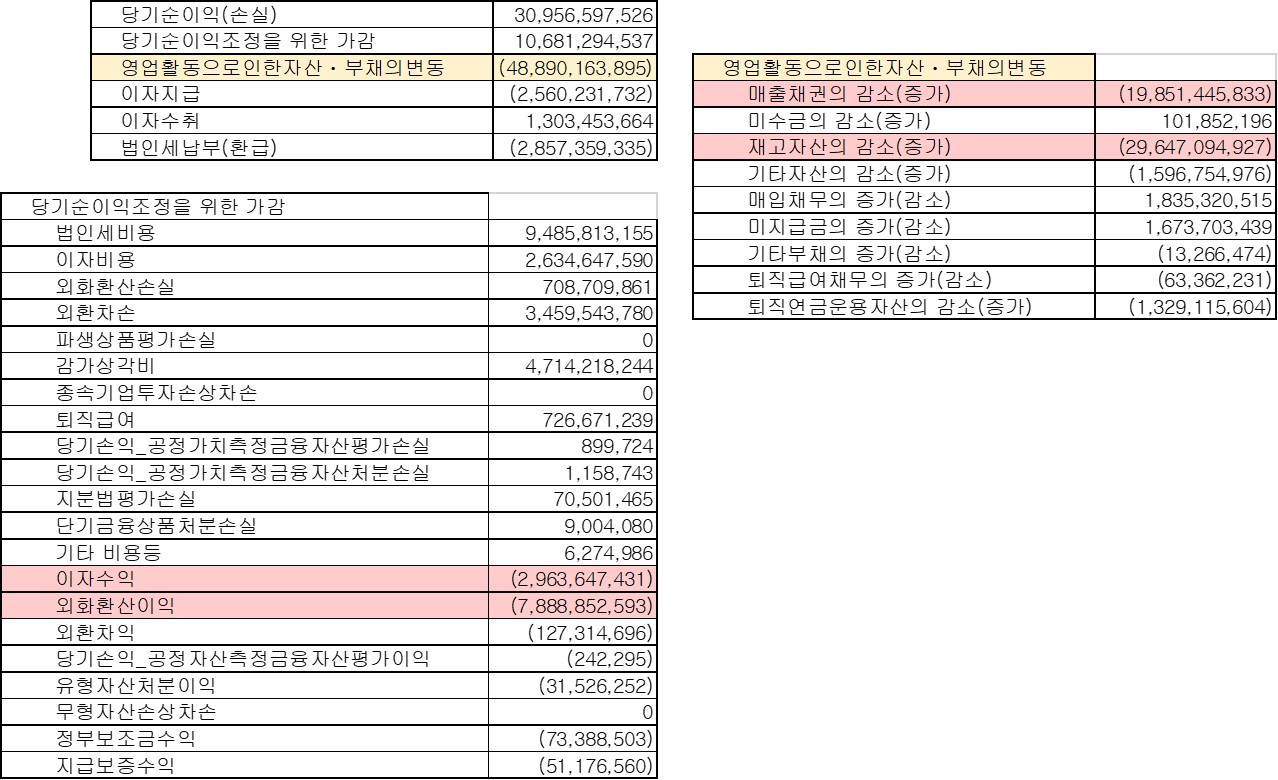 현금흐름표를 보면, 기껏 벌어온 당기순이익 310억 원을 ‘영업활동으로인한자산·부채의변동’이 490억 원이나 깎아먹는다는 걸 찾을 수 있다. 사업을 크게 늘리느라 뭔가가 있었는데 아까... 그래 맞다, 여기서도 매출채권과 재고자산 증가분이 주요 원인이다.