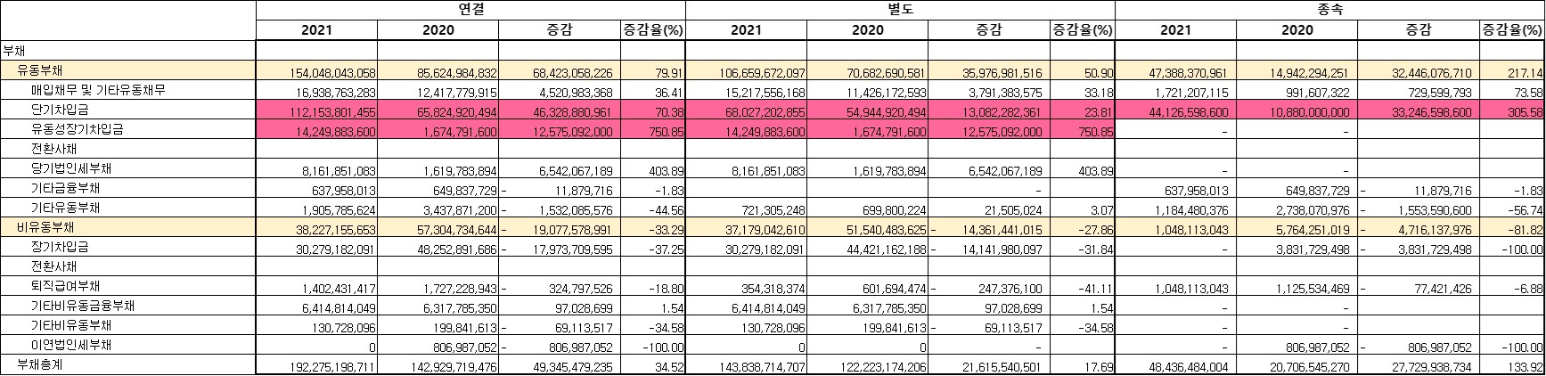 운전자본을 무겁게 하는 데 드는 돈 500억 원은 단기차입금과 유동성장기차입금(250억 원)으로 절반가량 조달했다. 단기차입금은 오히려 종속법인 쪽에서 330억 원이나 규모 있게 늘렸다. 어디에 쓰려고?