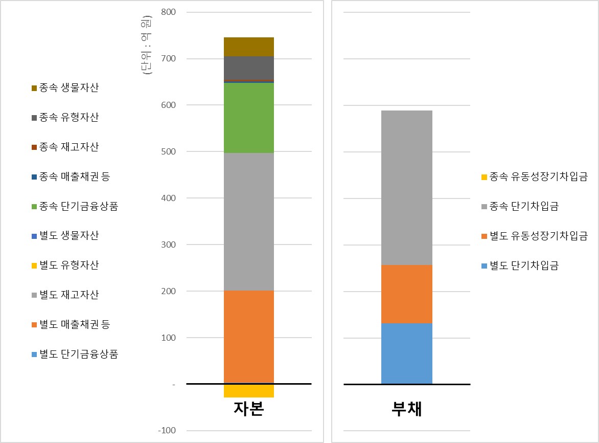 자산 3,210억 가운데 60%에 해당하는 1,920억이 부채다. 빚이 가진 돈의 1.5배다. 보기에 따라서는, 부채가 많은 편이다. 조금 더 가까이 들여다보면 자산에는 규모 순서대로 유형자산, 생물자산(이상 비유동자산), 재고자산, 매출채권, 단기금융상품(이상 유동자산) 비중이 크다. 눈에 띄는 부채 계정에는 단기차입금과 유동성장기차입금 정도가 있다.