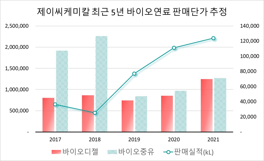 산업통상자원부가 신재생에너지 의무공급량을 51% 높여 발표했으니까, 제이씨케미칼의 바이오중유 판매도 무식하게 그만큼 늘어난다고 하자. 2021년에는 129,000 kL를 팔았다. 여기에 올해 수요를 표현하기 위해 1.51을 곱한 뒤 아까 추산해 둔 바이오중유 판매단가를 곱해준다.