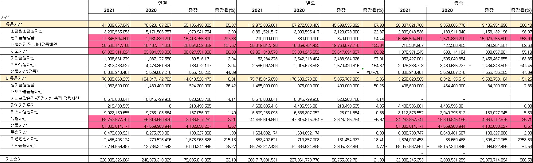 별도법인과 종속법인을 쪼개보자. 재고자산과 매출채권은 바이오연료를 제조하는 본업에서 늘었다. 각각 거의 두 배가 됐는데, 사업이 나빠진 걸까? 매출액을 두 계정으로 각각 나누어 계산해 본 회전율에는 심각한 하자가 보이지 않았다. 매출액이 50% 정도 늘었고, 회사에서도 물 들어올 때 노 젓는 마음으로 운전자본을 공격적으로 늘려가는 것 같다.