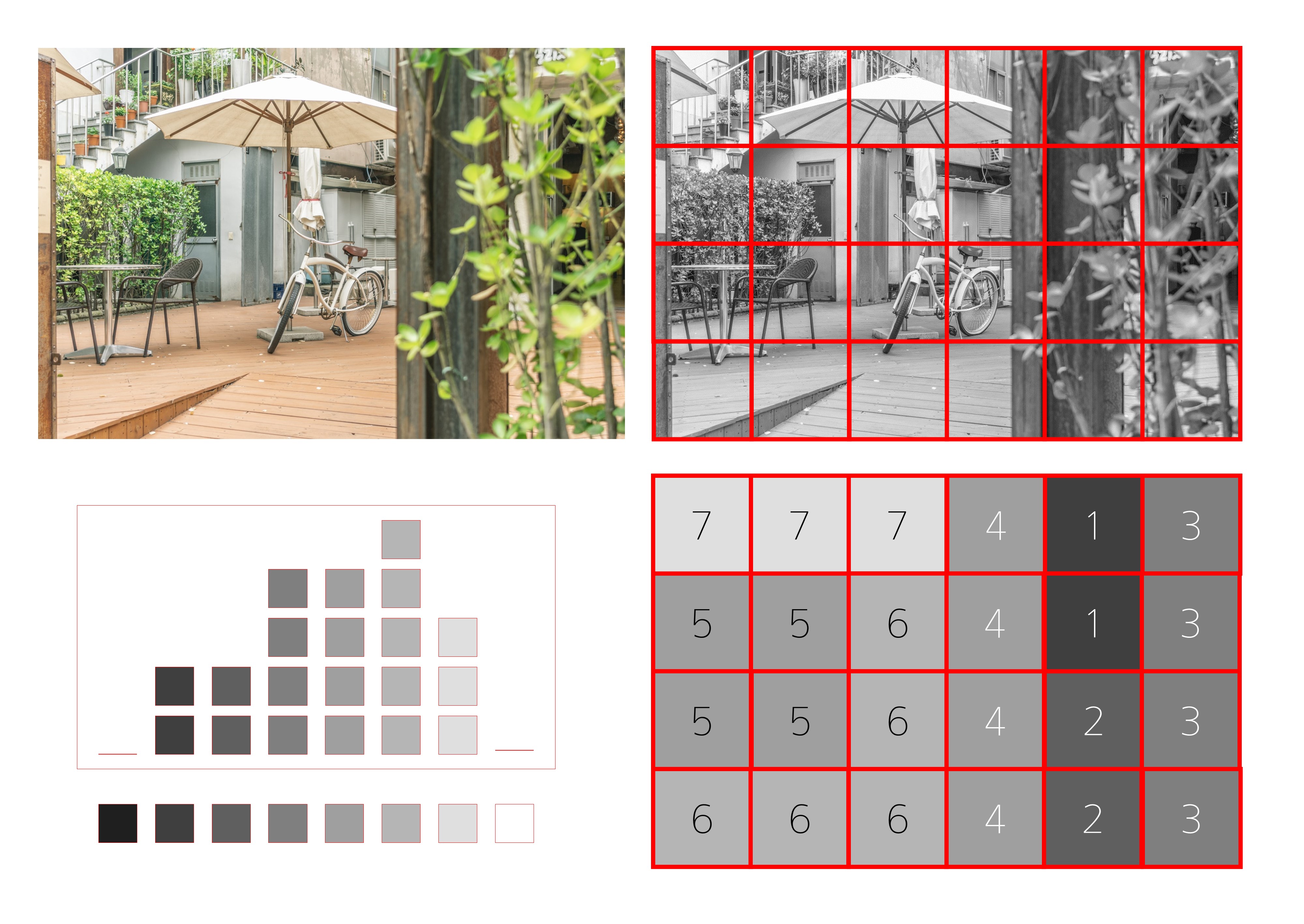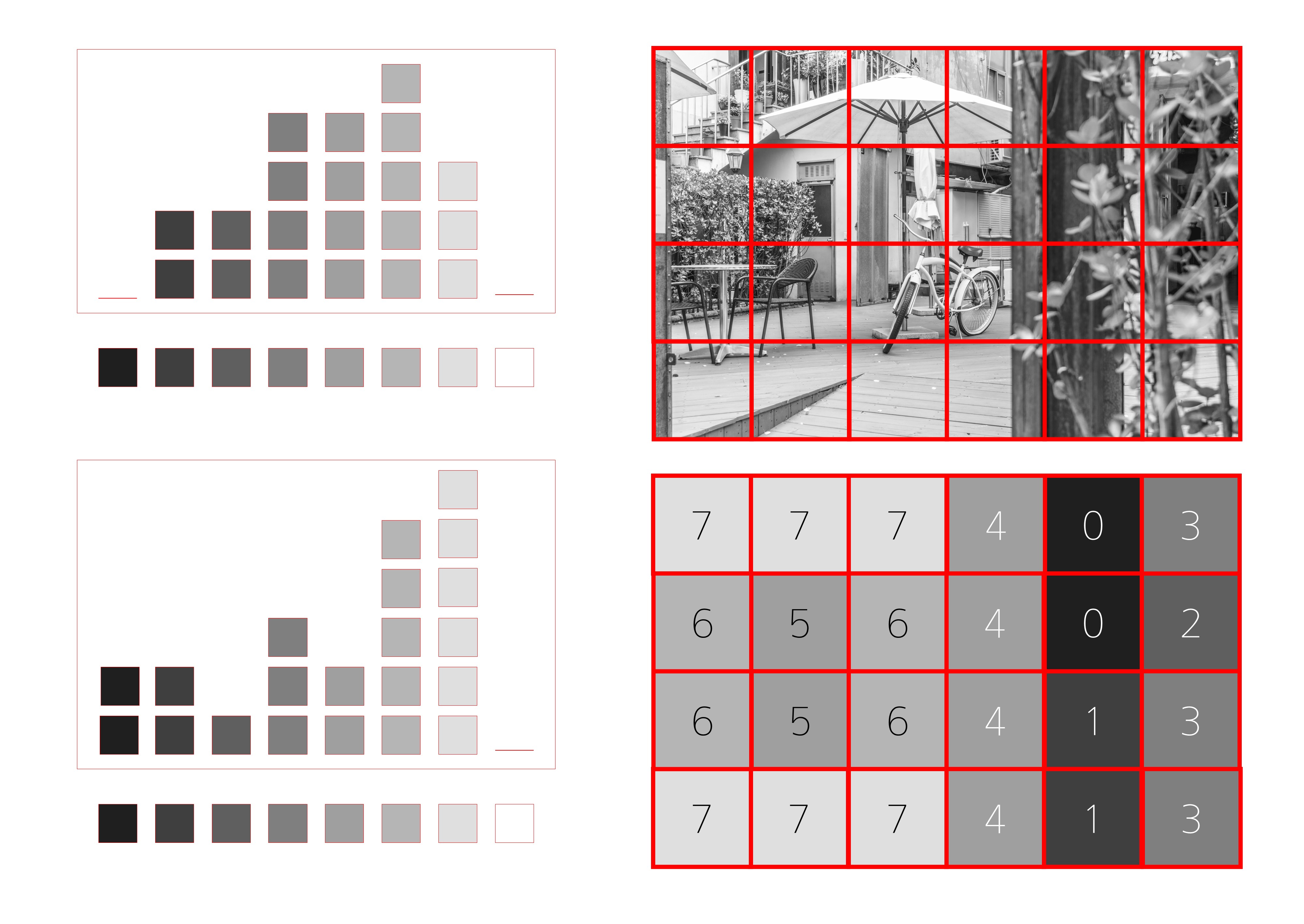 카메라가 측광을 할 땐 위 모식도처럼 화면을 흑백으로 인식한다고 얘기한 적이 있다. 각각의 픽셀이 가지는 흑백의 단위를 평균해서 노출계에 결과를 표시해준다고. 이제 각 단계의 명암별로 픽셀의 개수를 헤아려서 막대그래프를 그릴 수도 있다. 히스토그램이라고 한다. 파워포인트 노가다로 그릴 수 있었던 3비트 계조(8단계 흑백)의 24화소에서는 저게 막대그래프처럼 보이지만, 8비트 256단계 계조 위에 2400만 개의 픽셀을 뿌리면 내부과 꽉 찬 뾰족뾰족한 산처럼 보이는 그림이다.