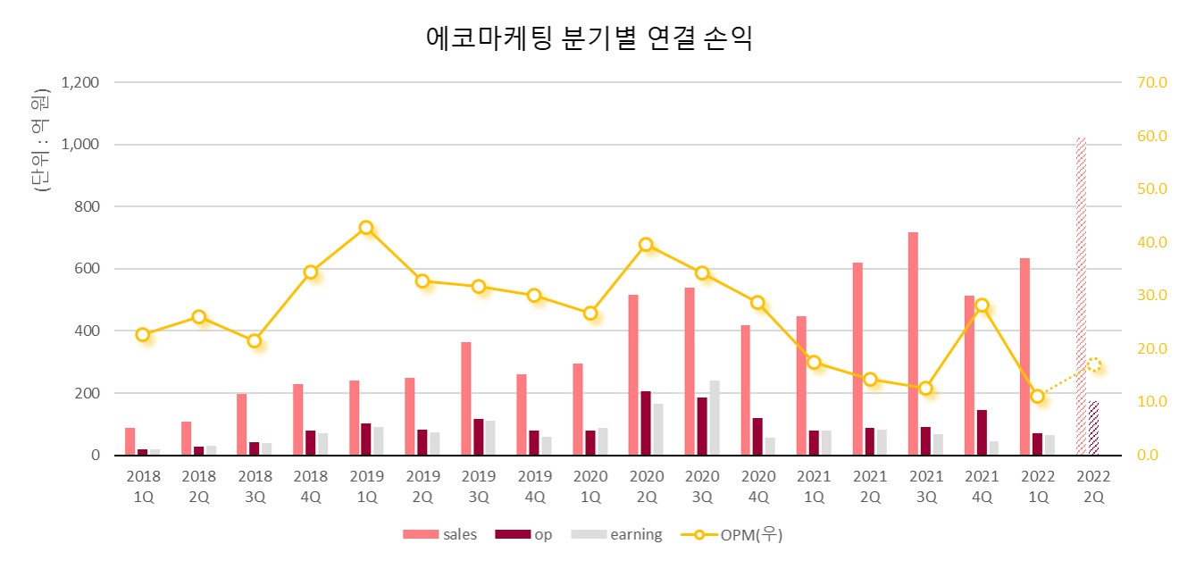 지난 1분기 실적에는 계절적 요인 및 회계적 매출 인식의 시점 차이로 인해 이월 된 매출의 부정적 영향이 반영되어 있습니다. 그러나, 계절적 요인이 플러스로 작용하고, 1분기에 인식을 못한 매출이 반영되는 2분기 실적에는 상황이 여러모로 긍정적으로 작용할 듯 합니다. 아무쪼록 에코마케팅의 성장을 큰 관심과 함께 지켜봐 주시길 부탁드립니다.