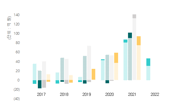 영업이익도 1·4분기보다는 2·3분기가 좋다. 수익성은 YoY로도 나빠진 것은 맞다. 색이 칠해진 부분(팜플랜테이션 종속법인 실적)은 쭉쭉 길어졌는데, 빗금친 부분(바이오연료 별도법인 실적)이 줄어들었다. (별도) 재무제표의 손익계산서를 확인해보면, 판매비와관리비는 작년 사업보고서에서 봤던 대로 여전히 잘 제어되고 있다.