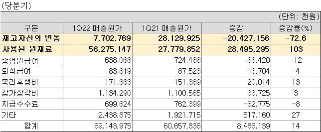 매출이 5% 나아갈 때 매출원가가 14% 뛰었다. 매출원가를 구성하는 재료비, 노무비, 경비 중에서도 유독 재료비만 YoY 두 배로 뛰었다. 처음에 확인했듯 '단가'는 비용이 상승한 것 이상으로 판매가를 인상했다. 문제는 심플하다. 회사는 재료와 제품의 재고를 늘렸고, 그걸 다 판매하지는 않았다. 바이오디젤은 만들어 둔 게 많이 남았고, 바이오중유도 판매를 많이 못했다.