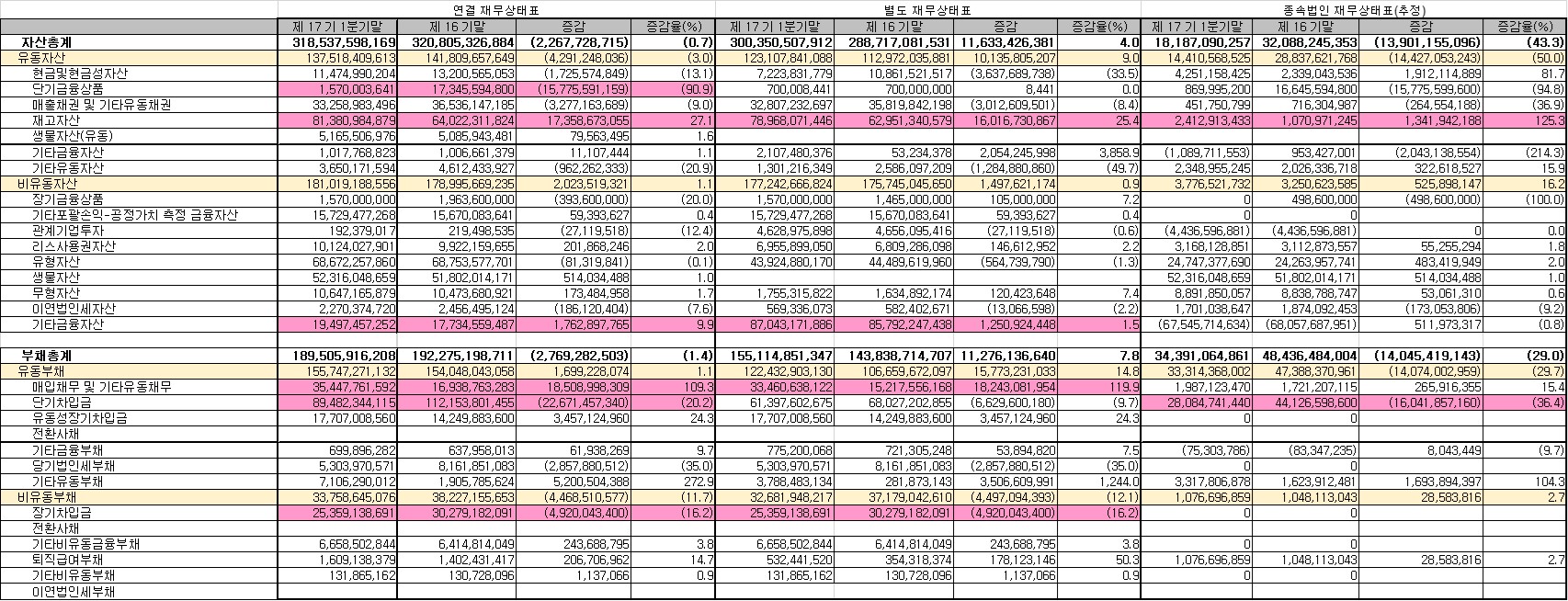 최종적으로, 재무상태표에 특별한 점이 없었는지 확인해본다. 연결 재무상태표를 기준으로 자본이 +5억, 부채가 -27.7억, 결국 자산이 -22.7억 변했다. 지난번 회사 측과의 통화한 대로, 상환을 위해 분리해 둔 현금(단기금융상품) 158억 원이 소진되면서 단기차입금 중 227억 원이 상환되는 형태가 됐다. 줄어든 단기차입금 중 160억 원이 인도네시아 종속법인 몫이었던 것 같다. 종속법인은 장기차입금도 50억 원 가량 상환했다.