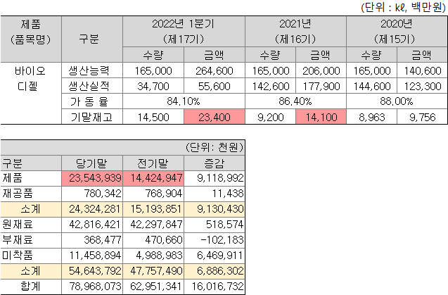 그 다음에 생산능력으로 가서, "바이오디젤"의 이번 1분기 생산실적을 참고한다. 34,700 kL를 55,600 백만 원어치 생산했다. kL당 평균으로 치면 약 160만 원이다. 그런데 만든 족족 다 팔아제낀 게 아니다. 작년 말 생산시설에 남아있던 바이오디젤 재고 9,200 kL가 있었고, 여기서 34,700 kL를 더 생산했지만, 팔고 남은 걸 헤아려 보니 14,500 kL나 된다. 그러니까 실제로 팔려나간 바이오디젤은 9200 + 34700 - 판매량 = 14500 으로부터 29,400 kL인 걸 알 수 있다. 그리고 남아있는 14,500 kL 재고의 가치가 회사는 23,400 백만 원이라고 적어주었으니까 단가는 161만 원이다.