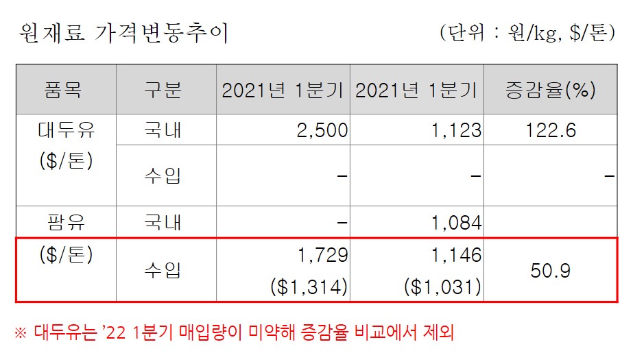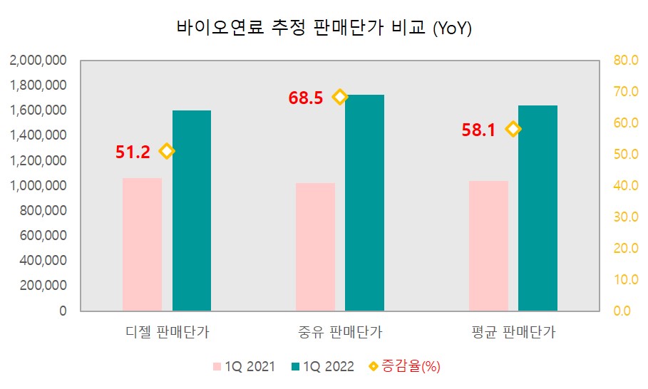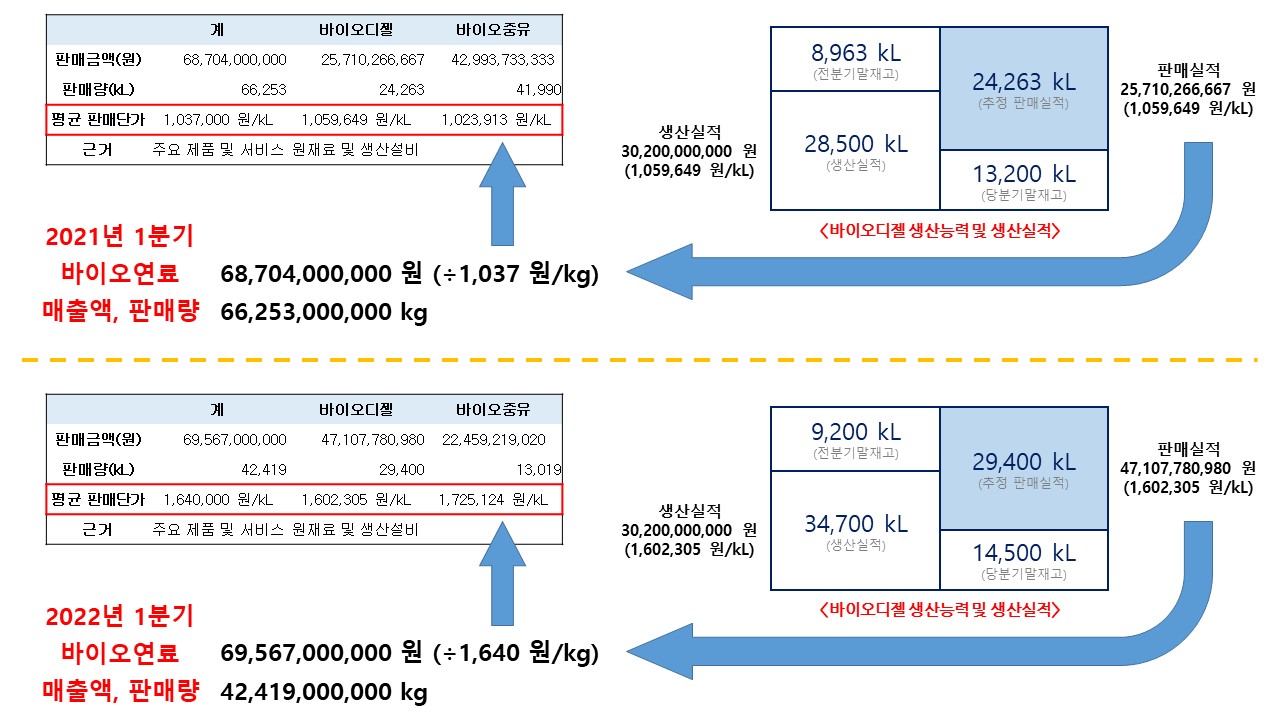 그 부분은 여러 가지 영향이 있을 수 있는데 일단 크게는 동서발전이 폐쇄되면서 바이오중유 판매량이 줄어든 영향이 있다. 바이오디젤 판매가격도 워낙 올랐지만 선적이 늦어지며 매출 인식이 이월된 부분도 있다. 판가 인상 효과가 나타나는 데까지 2개월 정도 딜레이가 있고, 팜유만 아니라 메탄올 같은 부재료 매입비용도 크게 오르면서 영향이 있었다. 당사는 4분기와 1분기가 비수기이지만 전분기와 전년 동기에 바이오중유 숫자가 워낙 잘 나온 측면도 있다.