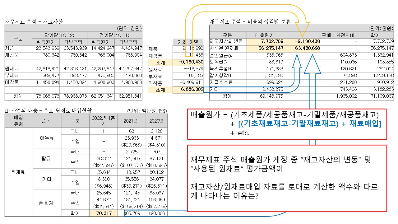 재무제표 주석으로 가서 비용의 성격별 분류에 기재된 매출원가를 계정별로 검토해 봤다. 주석의 재고자산과 원재료 매입 현황을 참고하고, 짧은 원가회계 강의도 들어봤다. 그런데도 회사의 발표와 내 계산은 크게 다르다.