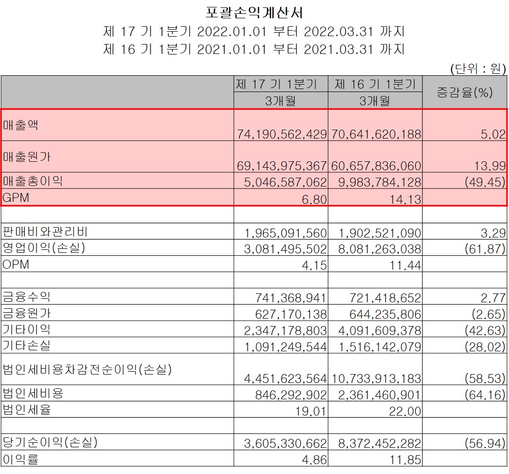 이번 분기보고서 별도법인 실적에 대해 의문이 있다. 질의요지는 하나다. 전년 동기와 비교하면 50% 정도의 원가 상승이 60% 가량의 판가 인상에 반영이 되었다고 추정된다. 그런데도 매출총이익률은 줄어들었는데...
