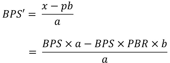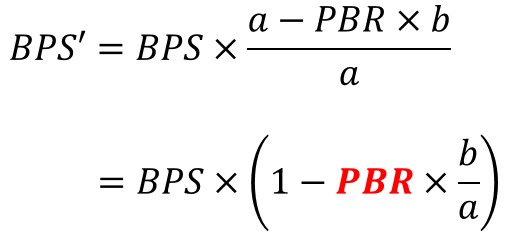 여기서 alpha가 0보다 크면 BPS'는 (기존 BPS에서) 줄어들게 되며, alpha가 0보다 작으면 BPS'는 커진다는 것을 알 수 있다. 즉, PBR은 언제나 0보다 크기 때문에 BPS'는 늘 기존보다 작아질 수밖에 없다.