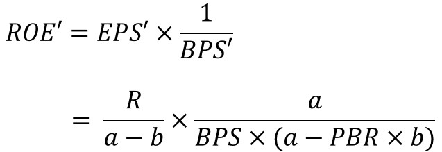 자기주식 취득에 따라 바뀐 BPS'를 ROE' 계산하는 분모에 적용해서 수학적 형태를 확인해 보자. EPS'를 R/(a-b)로 표현해주면 ROE'는