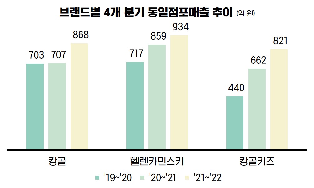 이거 계산하는 것도 재미있었다. 영업보고서를 통해 매년 말 브랜드별 매장 수를 일단 확인해둔다. 보통 매장 추가입점이 여름에 이뤄지기 때문에, 3분기+4분기와 다음해 1분기+2분기 브랜드 '오프라인' 매출액을 더해서 매장 수로 나눠줬다.