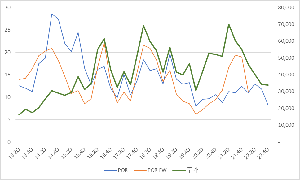 포워드 영업이익 700억 원에 비해 현재 시가총액은 7.43배, 과거 영업이익 기준 POR은 8.24배다. 역사적으로 비교해보면 FW POR 하단은 6.24배, TTM POR은 7.53배가 가장 낮았다. 대략 하단 근처라고 할 수 있겠다.