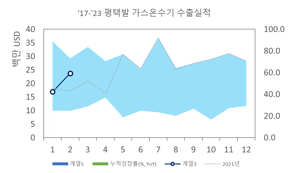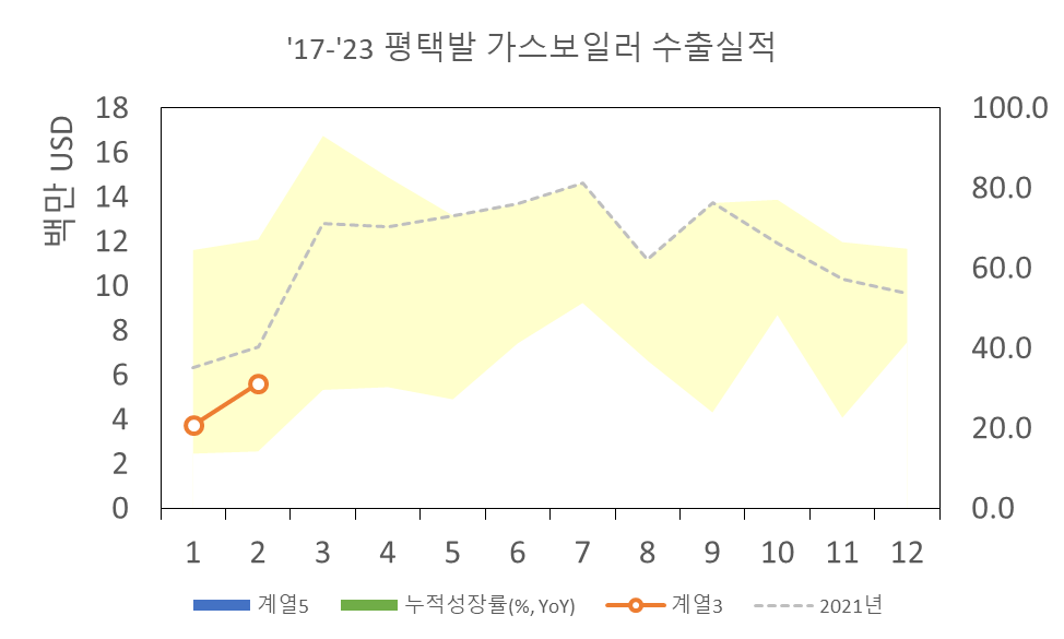 온수기 수출은 여전히 좋지 않지만, 시간이 흐르면 회복할 것으로 기대된다. 2022년 1분기에 가격 인상을 대비한 비축 수요가 컸기 때문에 직접 비교는 어렵다. 2023년 1~3월 물량을 2021년과 비교해도 더 성장하지는 못했지만, 해상 운임비가 크게 뛰었던 시절을 피하며 현지 재고를 활용하는 전략일 수도 있다. 실제 매출이 어떻게 찍히는지를 확인하는 게 현재로서는 더 낫다.