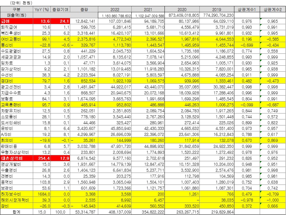 한편 비용의 성격별 분류를 펼쳐놓고, 개별 비용이 얼마나 될지 대충 합산해보기도 했다. 나머지는 늘어나던 비율만큼 높게 잡고, 물류비와 기타 정도만 낮춰봤다. 물류비는 2021년과 동일하게, 대손상각비가 포함된 기타는 90억 원 줄여서 잡으면 총 비용이 11,200억 원 정도가 되는데, 매출액이 보수적으로 늘어서 12,000억 원이 되면 영업이익이 800억 원 남는다.
