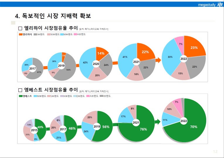 초등학생 교육에서는 품질보다 학부모의 뇌리에 브랜드 인지도가 얼마나 자리잡고 있느냐가 더 중요하다. 메가스터디교육의 초등교육 브랜드 엘리하이는 경쟁사들보다 비교적 늦은 2018년 론칭했다. 하지만 엠베스트와 연계된 시스템과 광고모델로 채용한 유재석, 홍진경 씨를 어필하며 빠르게 시장 점유율을 늘렸다.