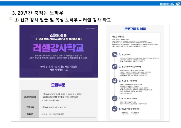 게다가 메가스터디 오프라인 학원에서는 일타 강사로의 도약을 꿈꾸는 뉴페이스 강사들이 실력을(?) 갈고 닦는 중이다. 회사에서도 강사들의 성장을 체계적으로 이끌고 있다는 점에서, 이 경제적 해자는 상당히 깊고도 넓다고 느껴진다.