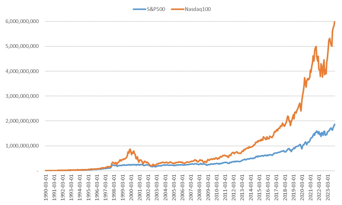 결론부터 얘기하자면, 달러 환율 기록을 구할 수 있는 1990년 3월부터 2024년 2월까지의 구간에서 나스닥 100 지수에 대한 적립식 투자의 연평균 수익률은 15.9%였다. S&P500의 경우 같은 조건에서 10.9%를 기록했다. 배당금을 재투자하는 효과를 반영해도 5%에 이르는 격차를 메우기는 어려워 보인다.