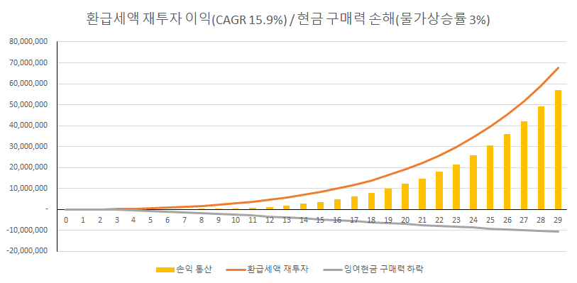 이렇게 투자 기간이 길어질 수록 수익이나 비용의 미세한 차이도 복리 효과로 누적되어 어마어마하게 다른 결과를 만들어낼 수 있다. 그래서 당장 냈어야 할 세금 같은 비용을 최소 10년 뒤로 미룰 수 있는 것은 잠재적이지만 어찌보면 가장 커다란 혜택이다.