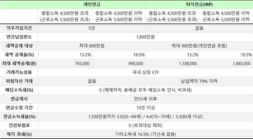 연금계좌에서는 국내 상장된 ETF만 거래할 수 있다. ETF에서 매매차익이나 분배금 수익을 얻으면 보통의 계좌에서는 모두 15.4%의 배당소득세를 뜯기게 되지만, 연금계좌에서는 이 모든 세금을 당장은 내지 않는다. 대신 연금을 수령할 때 세율이 훨씬 낮은(나이에 따라 3.3~5.5%) 연금소득세를 차감하는 것으로 미루는 효과가 있다.