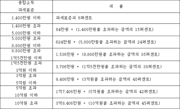 제55조(세율) ①거주자의 종합소득에 대한 소득세는 해당 연도의 종합소득과세표준에 다음의 세율을 적용하여 계산한 금액을 그 세액으로 한다.