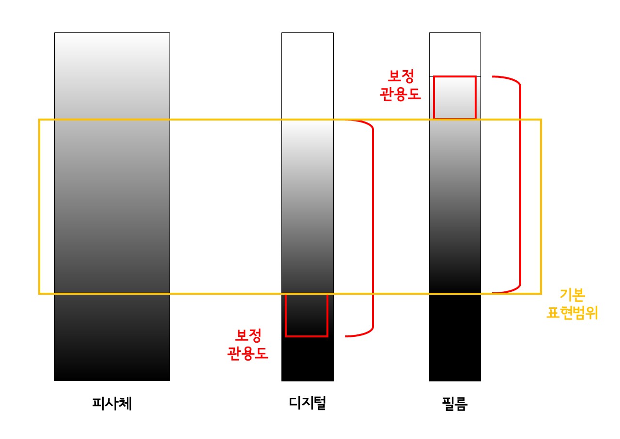 위의 그림은 내가 이해한 걸 개념적으로만 나타낸 방식이다. 촬영하는 순간 적용되는 기본 DR구간이 동일하더라도, 전체 DR의 폭이 밝은 쪽이나 어두운 쪽으로 치우칠 수 있는 자유도는 있다. 나는, 네거티브 필름은 암부 보정 관용도가 작은 대신 명부 보정 관용도가 크다고 믿는다. 반대로 포지티브 촬영물에서는 명부 관용도를 양보한 대신 암부에서의 DR을 넓게 가져갔다고 이해하는 중이다.
