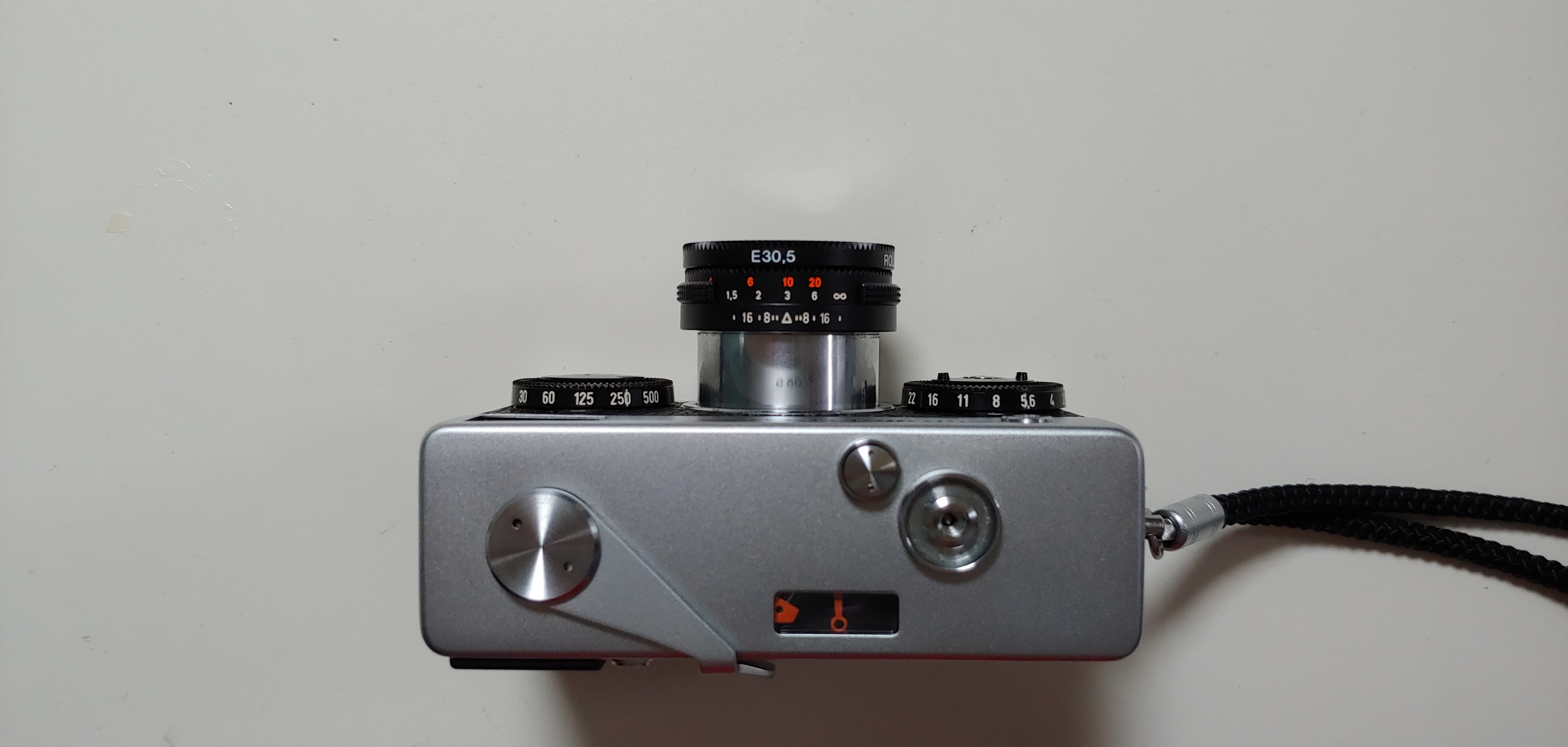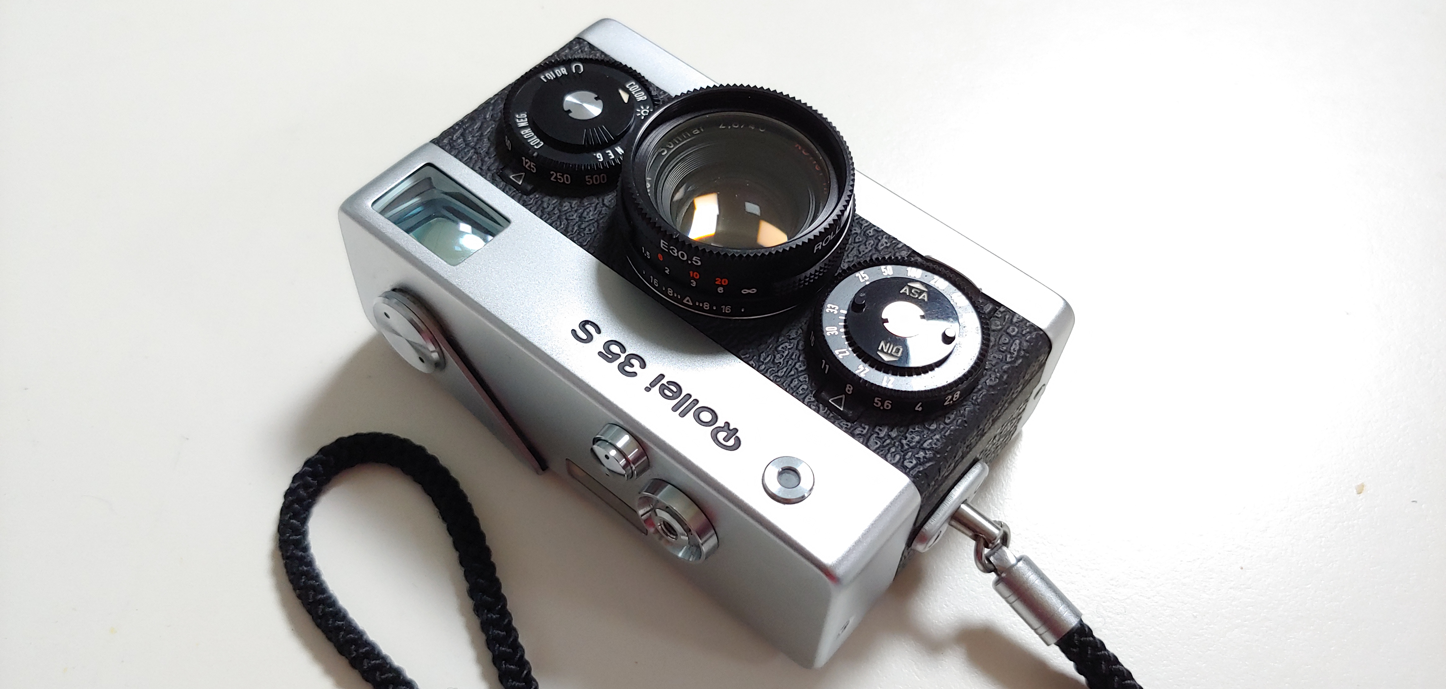 롤라이35는 작동하는 일반 필름카메라 중에는 아마도 가장 작은 걸지도 모릅니다. 게다가 렌즈도 찍을 때만 돌출시키고 평소에는 집어넣을 수 있는 침동식이라 휴대성 하나는 극강입니다. 이렇게 작아도 몸 안에 있을 건 다 있습니다. 대신 필름카운터와 플래시용 핫슈, 필름 리와인딩 레버가 하판으로 옮겨 간 것은 디자인 상 불가피한 선택이었을 겁니다. 뒷면에는 아무 것도 없습니다. 상판에 렌즈의 침동을 조절하기 위한 버튼 하나와 셔터, 노출계의 바늘이 보이고, 찍을 때마다 필름을 옮겨주는 와인더는 특이하게 왼쪽으로 가 있습니다. 이 레버 감을 때의 톱니바퀴 돌아가는 그 느낌이 필름카메라를 사용하는 주요 이유 중 하나이기도 합니다.
