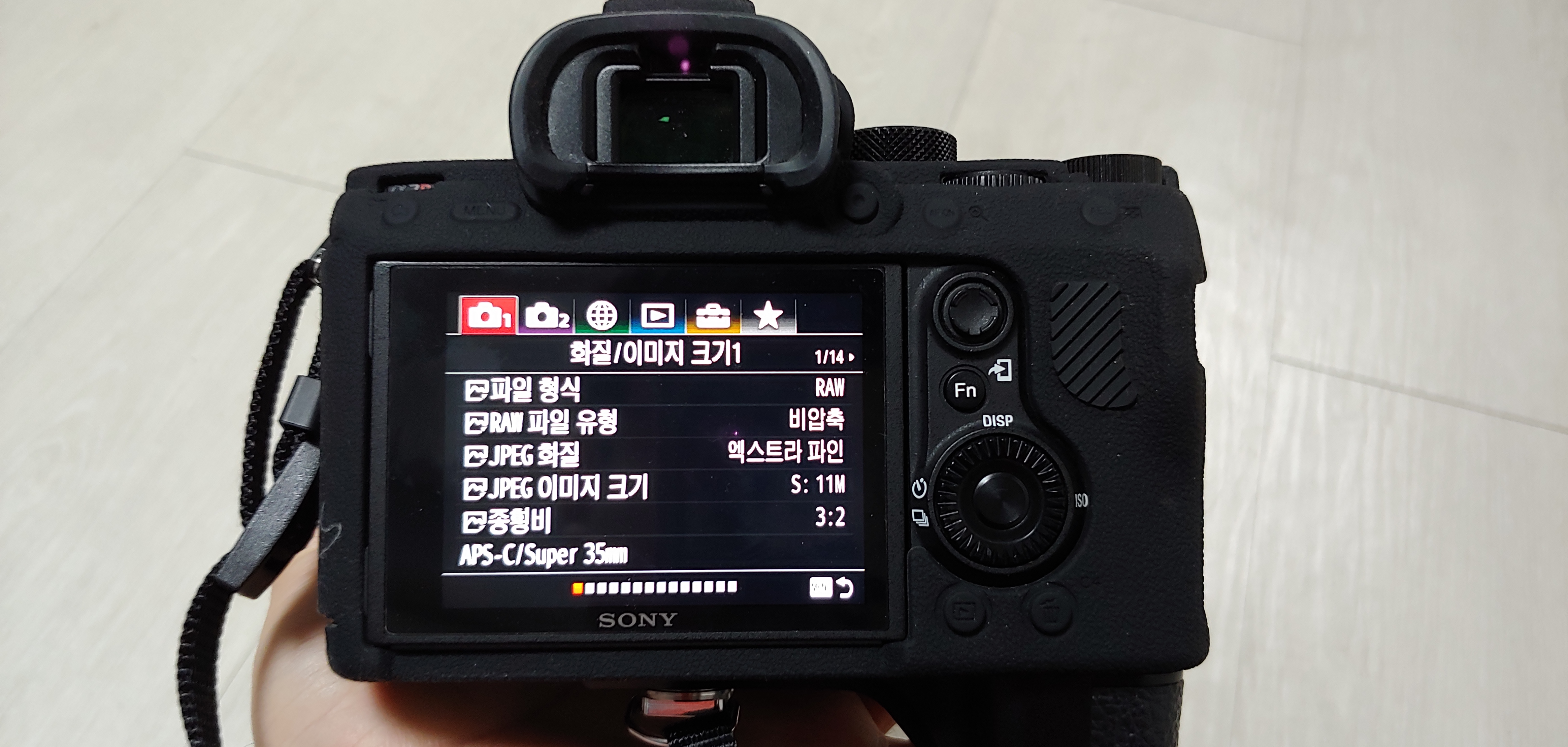 파일형식은 RAW만 설정한다. 그 아래 유형은 비압축으로 해두었다. JPEG화질은 어차피 촬영하지 않으니 엑스트라파인에다가 이미지 크기 S로 해두었다. 그래도 11MB나 된다. 종횡비는 3:2이고, APS-C모드는 수동, 끔으로 해뒀다. 필요할 때 켬으로 바꾸면 된다. 셔터속도가 길 때 노이즈를 줄여주는 장시간 노출 NR은 끔으로 해준다. 기다리는 게 싫어서. 전문가가 아니니 색공간도 sRGB로 무난하게 해줬다.