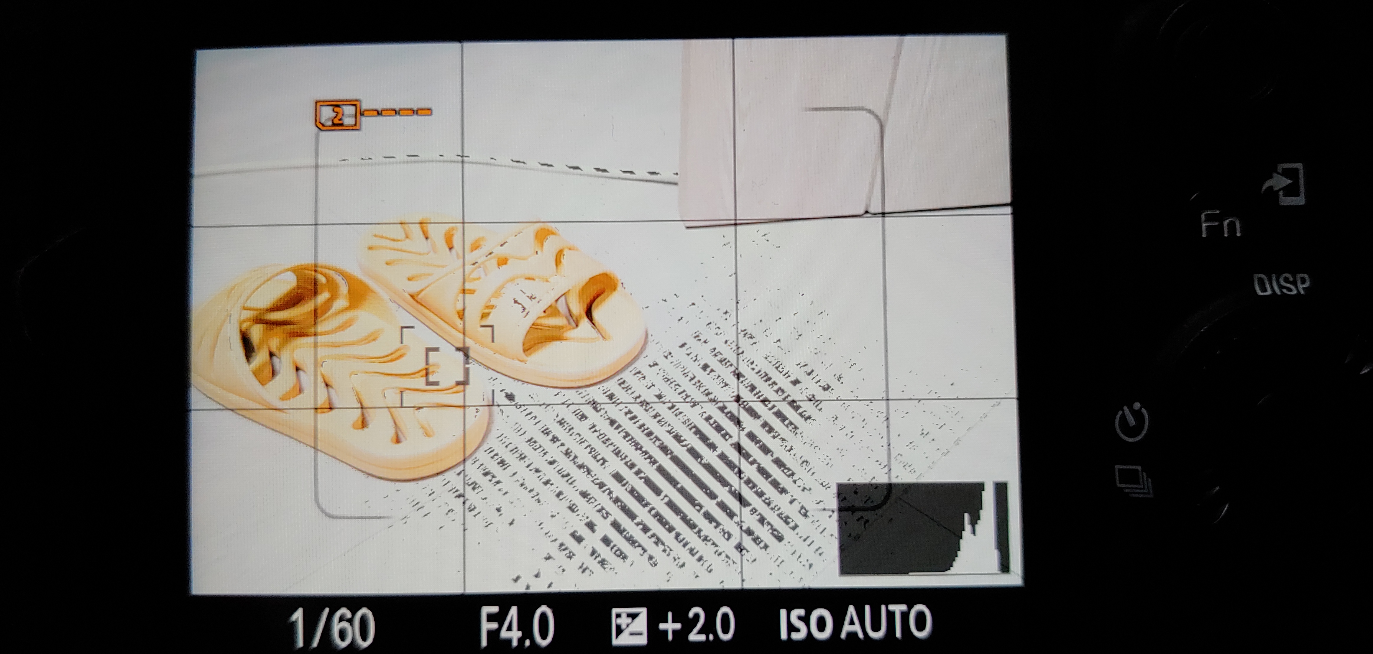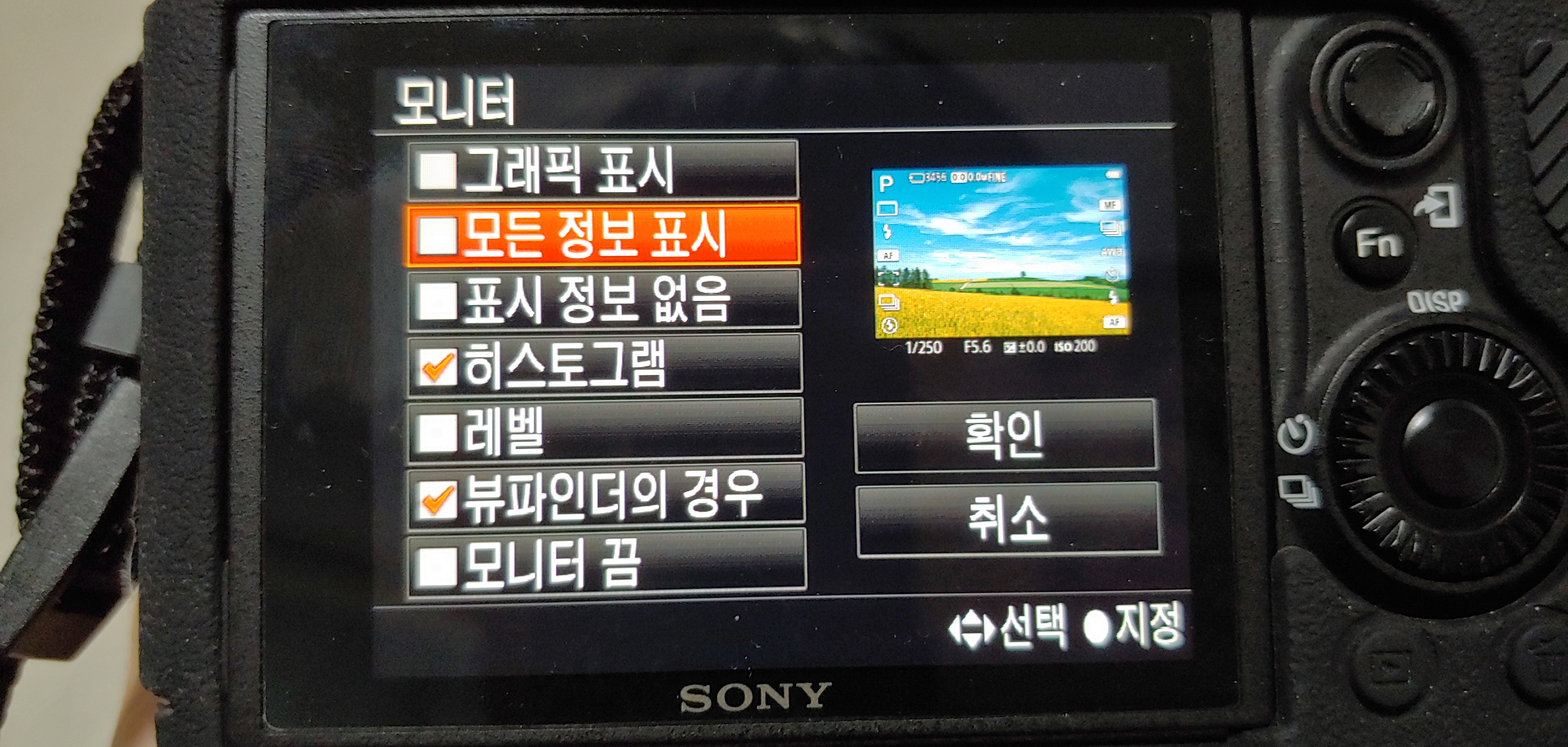 마지막 DISP 버튼을 설정해주자. 휠의 위쪽 방향키가 DISP(lay)를 전환하는 버튼인데, 모니터(LCD)를 사용중일 때와 파인더(뷰파인더)를 사용중일 때를 각각 지정할 수 있다. 모니터 사용 중에는 히스토그램과 뷰파인더의 경우, 이 두 가지만 체크 해줬다. DISP 버튼을 누를 때마다 이 두 화면이 전환될 것이다. 파인더에 들어가서도 히스토그램을 체크해줬다. 나머지 자질구레한 것들은 모두 뺐다. 확인을 눌러 주자. 나는 히스토그램을 보면서 노출을 맞춘다. 하이라이트 쪽에 뭉치는 픽셀들이 나타나지 않도록 해주는 데 기준을 둔다. 이건 그냥 내 선호도일 뿐이니 반드시 따라할 필요가 없다.